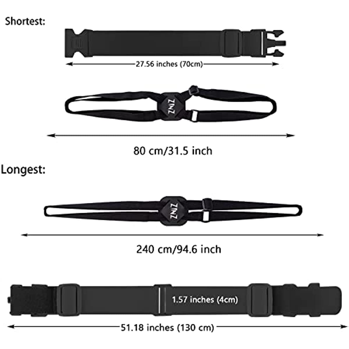 Material and Size - Material: Nylon, elastic rubber and E-Plastic; The long size: 30.5"-51.18"(77.5cm-130cm), the short size: 16.7"-27.56"( 42.5cm-70cm), width 1.57"(4cm); "8" type luggage strap size: 22.83"-28.74"(58cm-73cm); These dimensions are measured in an unstretched state. The lengths of bungees can be extended more than 1 times by stretching.